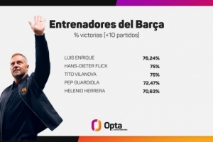 数据统计显示,弗里克在巴萨各项赛事44场取得33胜,75%胜率追平比拉诺瓦。在队史执教超过10场的教练中,胜率仅次于恩里克(76.24%)。瓜迪奥拉胜率72.47%位列第四,埃伦尼奥-埃雷拉以70.63%胜率位列第五。