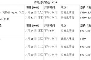 「中国香港足球盛会2025」主办方继早前公布7月26日利物浦对阵AC米兰的「渣打杯」及7月31日史上首次海外举行的北伦敦德比(阿森纳对热刺)后,日前正式公布赛事票价及开售日期。
