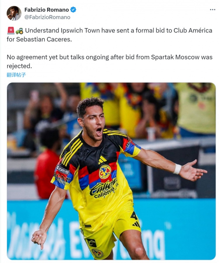 罗马诺透露,伊普斯维奇对效力于墨西哥美洲的乌拉圭中卫卡塞雷斯感兴趣,已经向墨西哥美洲提交正式报价。